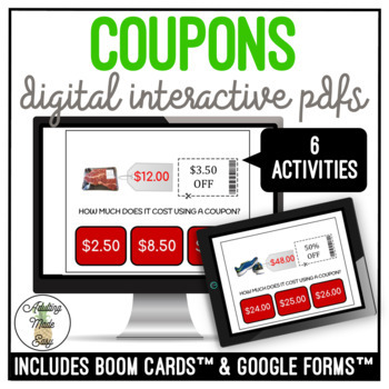 How Much Does It Cost With Coupons? NO PREP, PAPERLESS, differentiated digital interactive consumer math activities that have students practice applying coupons (by $ amount or %) to product purchases and calculating the price. Distance or remote learning