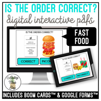 NO PREP, PAPERLESS, digital interactive activities to help practice vocational skills in reading restaurant order receipts and checking to make sure the order has everything before giving to a customer. Contains common items like hamburger & ingredients, french fries, soft drinks, taco, ice cream and more. Distance or remote learning