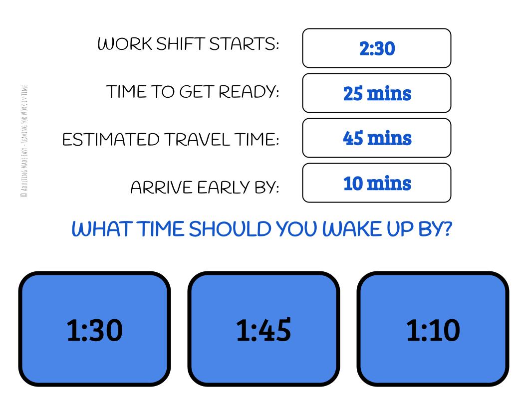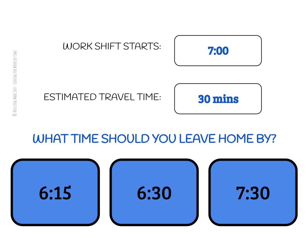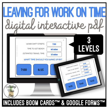 Practice elapsed time in a vocational way. Students identify the time they are supposed to arrive at work, and then calculate the estimated travel time, time it takes to get ready for work, and arriving earlier than scheduled. A visual word problem format. Great for pre-vocational skills of being punctual and planning ahead! NO PREP, PAPERLESS vocational career activity! Distance and remote learning