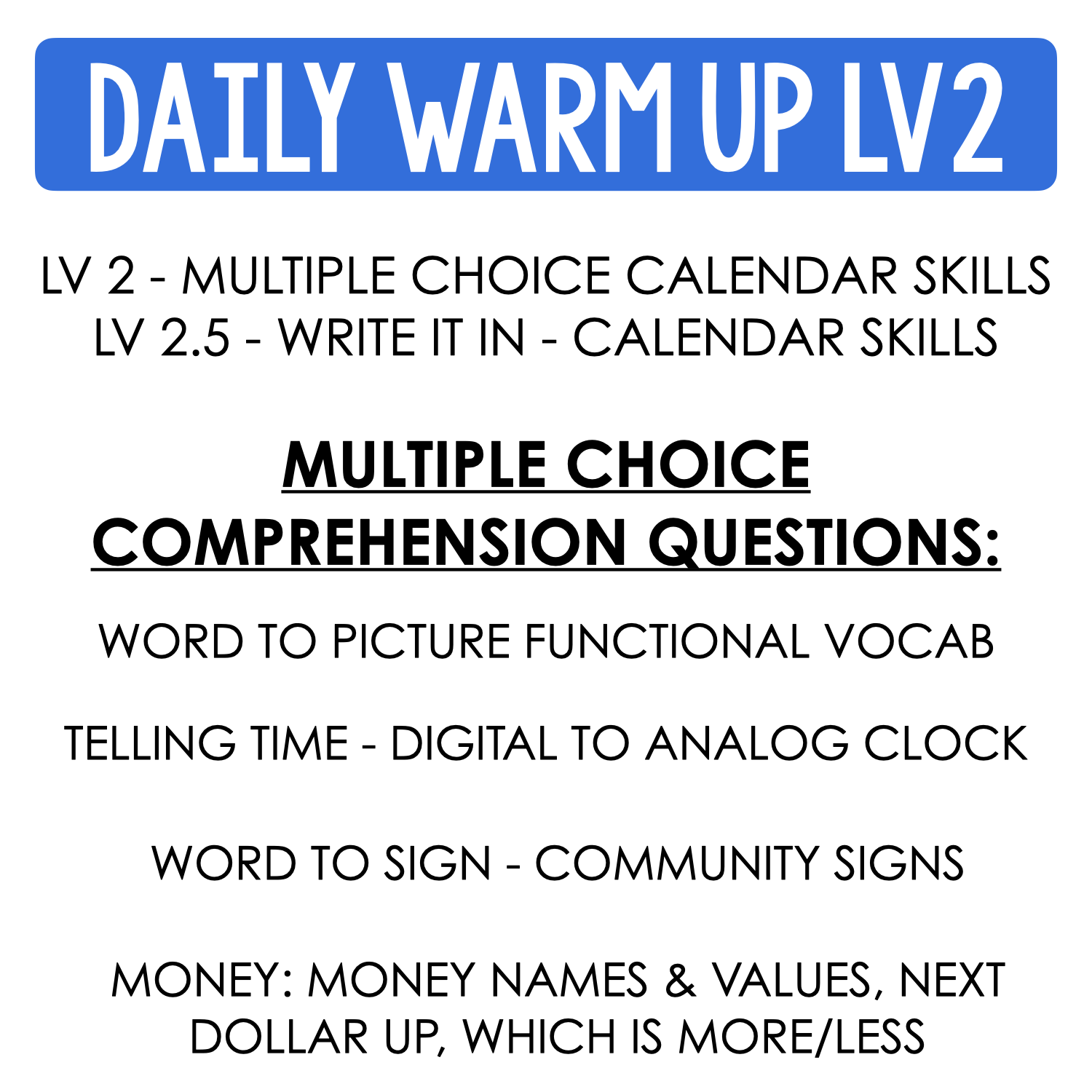 • Same content as Level 1, but with Write in Calendar Skills instead of multiple choice.