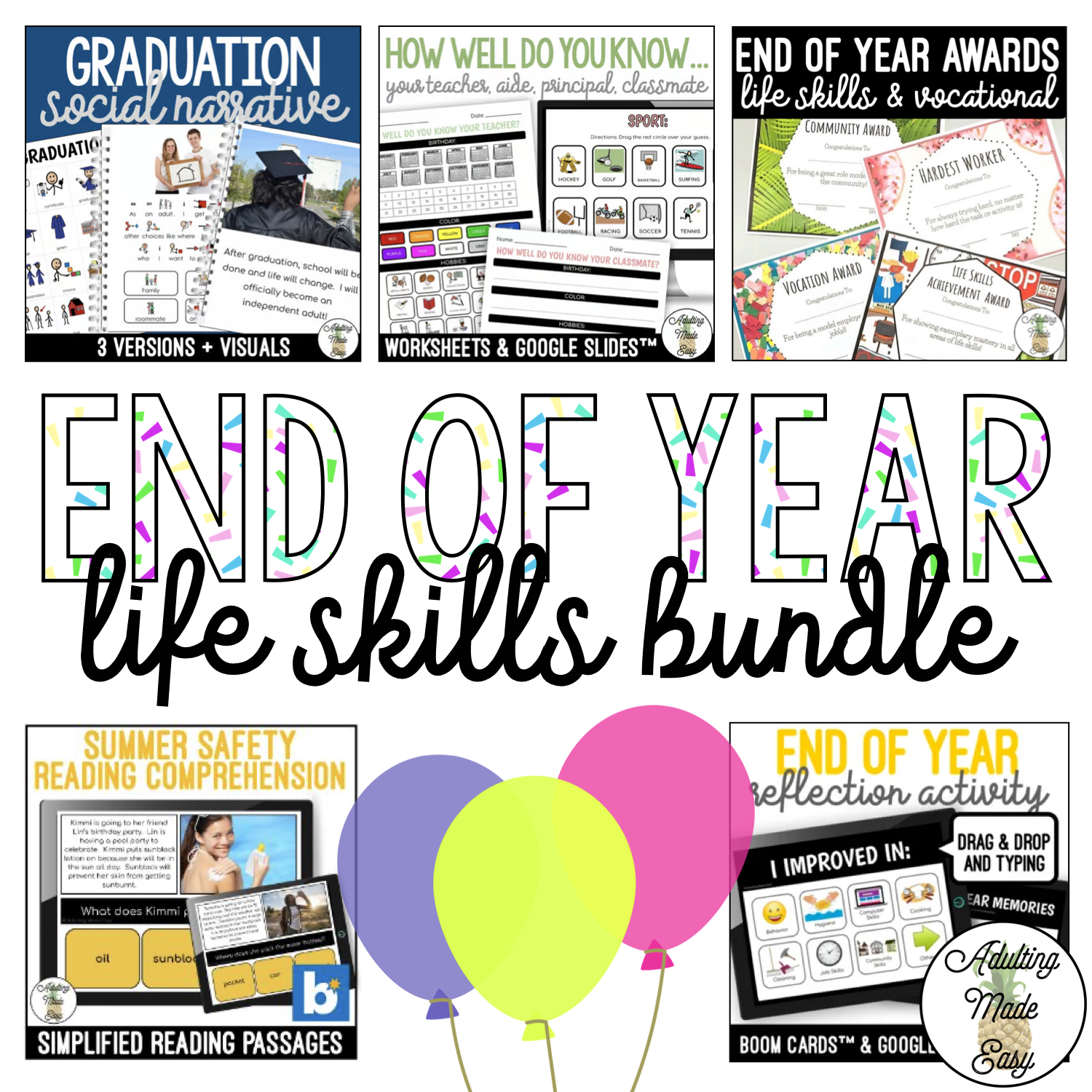 MONEY SAVING BUNDLE of life skills activities that are end of year & summer -themed but also functional to everyday life. Think to yourself – graduation prep, reflecting on the year, celebrating this year’s successes, summer safety, planning for a trip and more. Here are math, reading, art and other functional activities you can use this April, May and June!