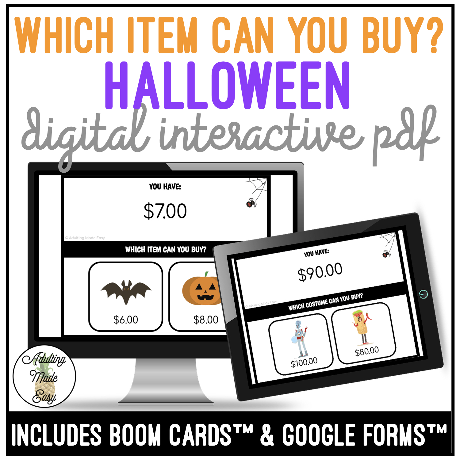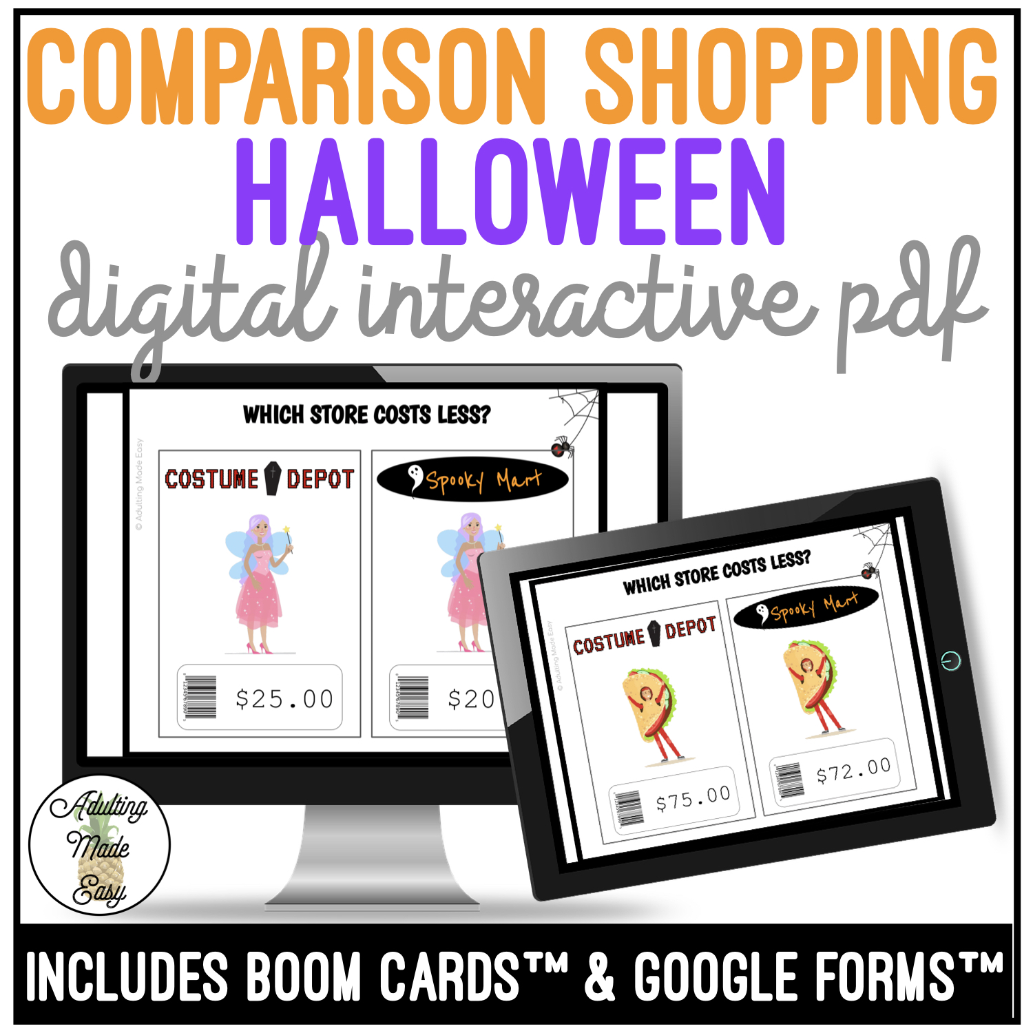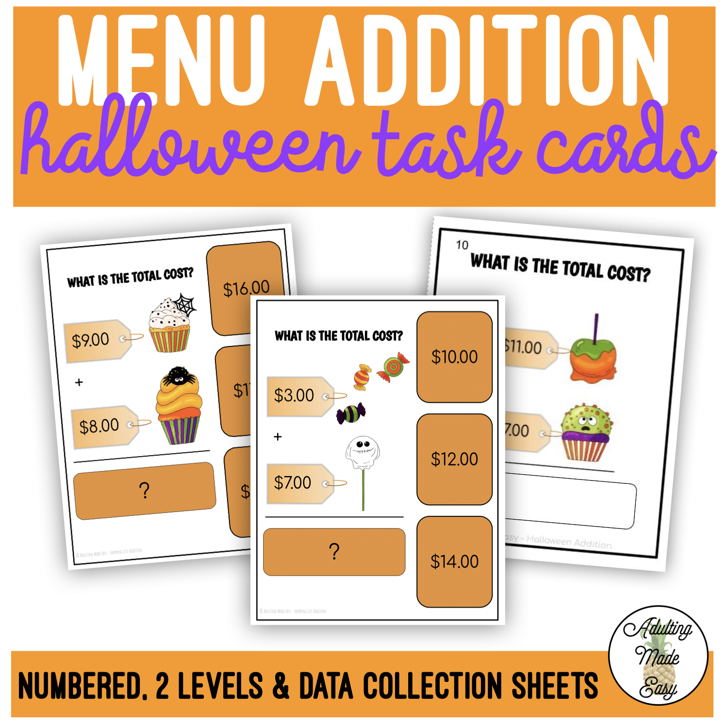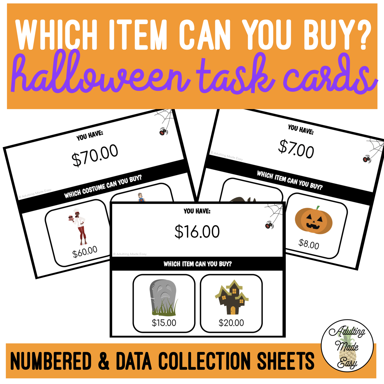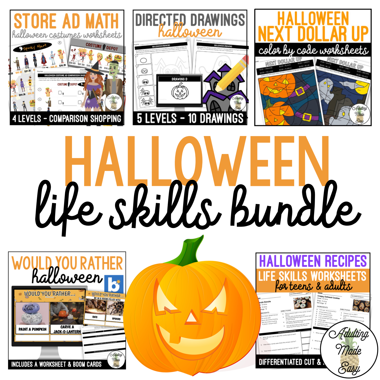 MONEY SAVING BUNDLE of life skills activities that are Halloween-themed but also functional to everyday life. Think to yourself – you Comparison Shop for a Halloween costume or cook a fun spooky recipe. Here are math, reading, art and other functional activities you can use this October!