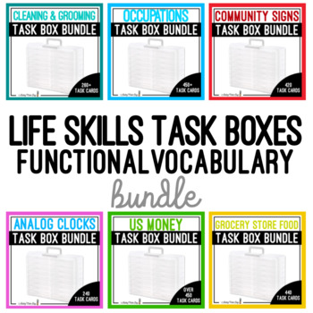 Money saving bundle of over 4,000 differentiated functional reading task cards with functional vocabulary for the grocery & hardware store, cooking, measurements, analog clocks, money (US currency), community signs, banking and more! Promotes independence for life skills special education or English language learners, and a great age appropriate & engaging activity for independent work stations or centers.
