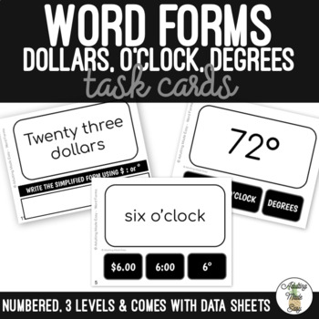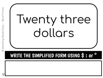 Simplifying or expanding dollars, o’clock, and degrees into or from word form. This activity is great for special education students Distance or remote learning