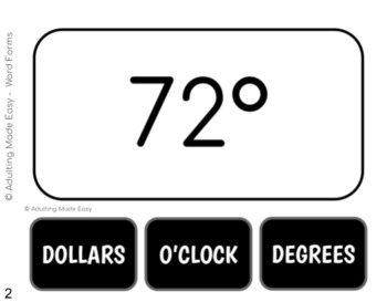 - Level 2 – Students will look at an expanded word form and decide which simple word with symbols for $, time, and degrees is the correct answer.