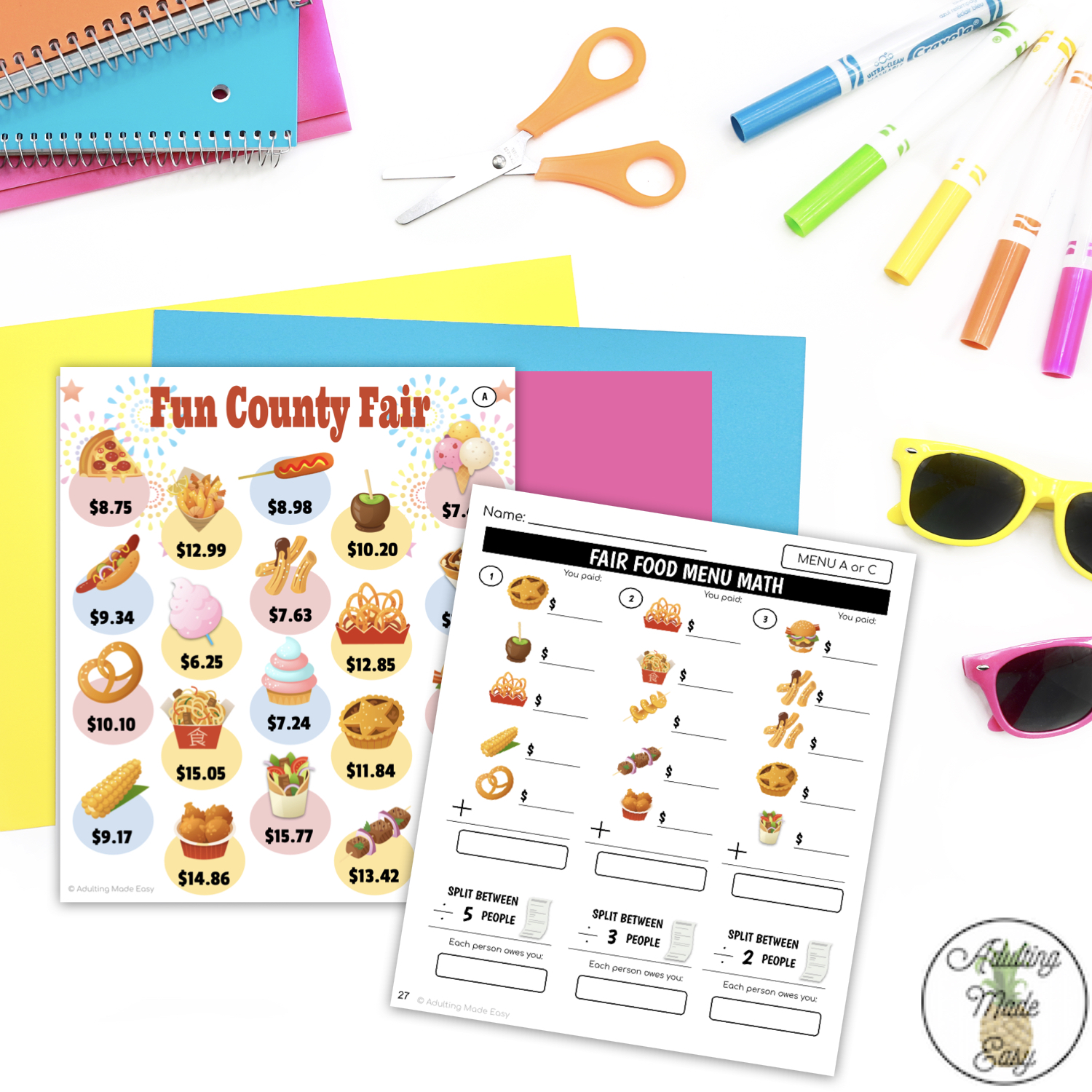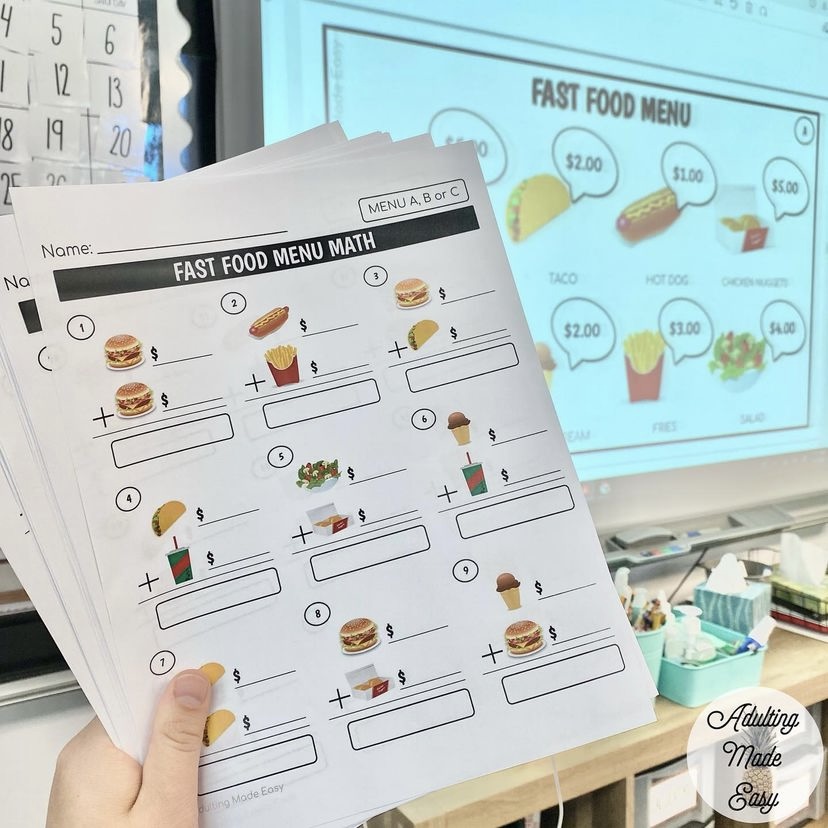 • Worksheets that coordinate with a few different menus that students will look up the price to and write their own subtraction problem matching the visuals