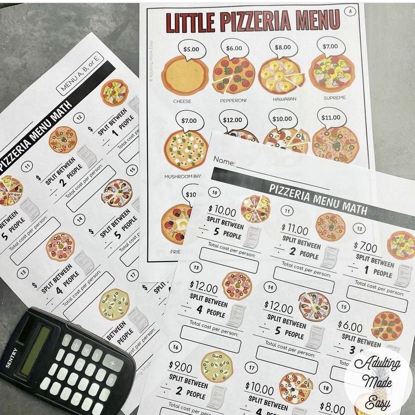 Money saving bundle of a full year of themed functional math worksheets for simplified & visual life skills addition, subtraction, multiplication and division problems using priced menus.