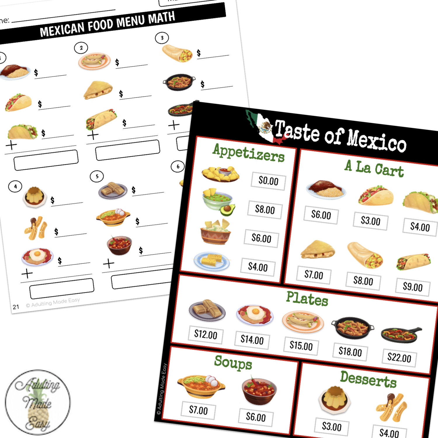 Simplified Functional & differentiated life skills addition problems using priced menus for a Mexican restaurant with tacos, burritos, beans, rice, chips & salsa and more!