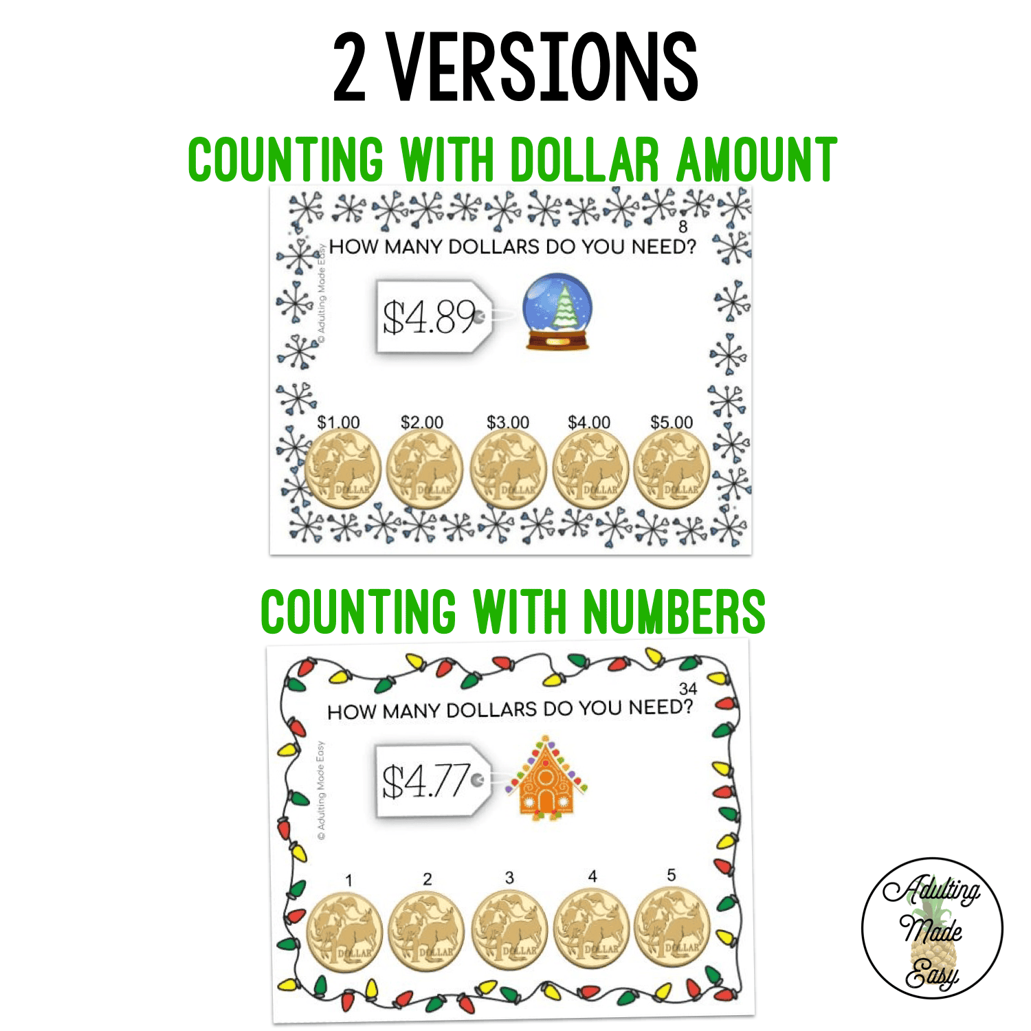 Festive money practice with gifts, candy canes, gingerbread, ornaments, hot cocoa, Hanukkah items, snowflakes, and more! Perfect for special education and students who need hands-on practice touching and counting money.