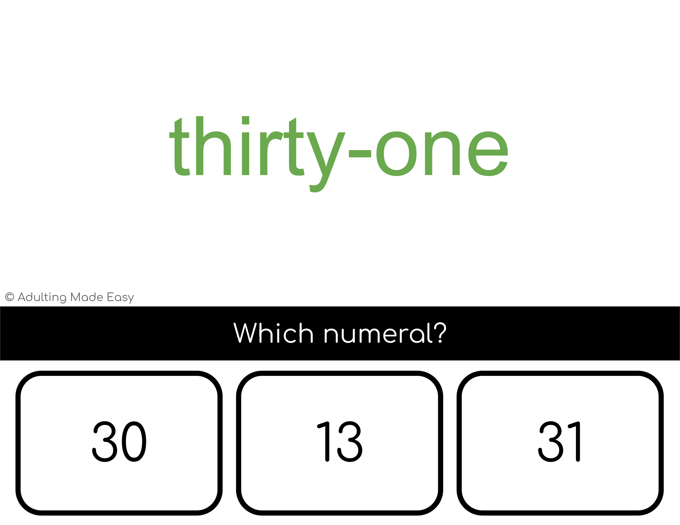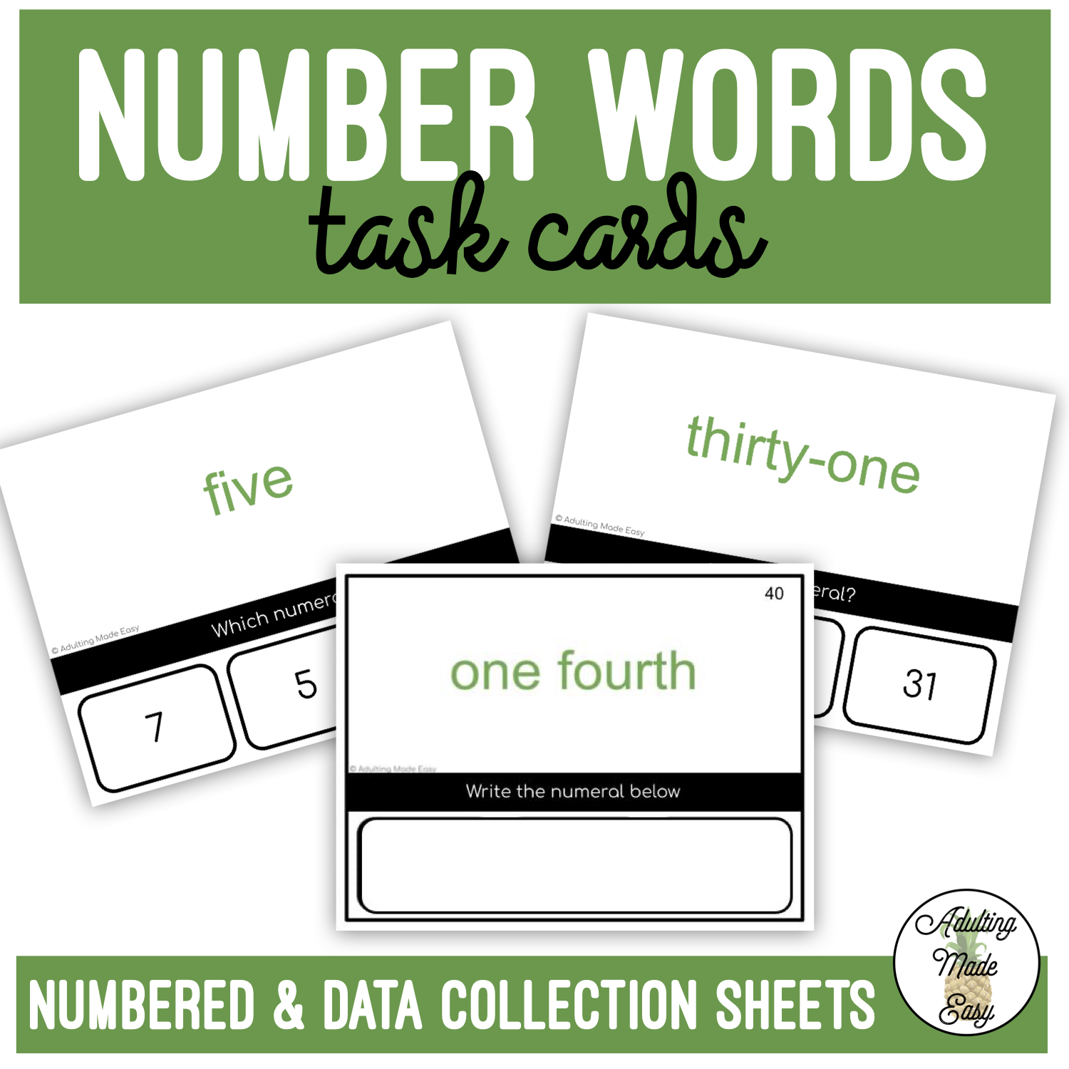 Academic Math Skills can also be practiced for vocational skills and life skills. Students will identify the correct numeral to the number word. Including single digits, intervals of 10, teens, hyphenated, hundred, thousand, one million, and a few fractions. Great activity for special education having limited field of 3 answer options.