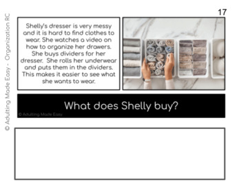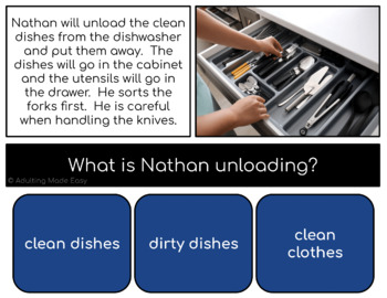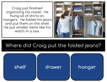 Simplified life skills organize themed passages consist of 4 short sentences each and real photos. Questions focus on WH questions among a limited field of 3 answer choices. This activity is great for special education students.