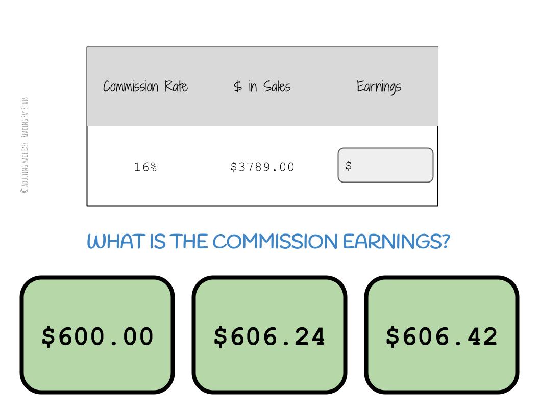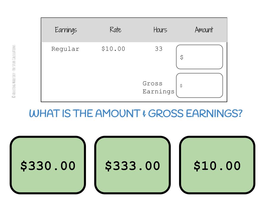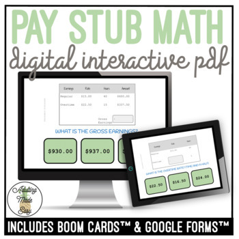 The pay stub visuals on this interactive activity are simplified by section so that the student can focus on calculating one thing at a time: Amount, Gross Earnings, Overtime Rate, and Commission. This work skill is important so that students understand their pay stubs and can double-check for clerical errors. Simple multiplication, decimal, & percentage.