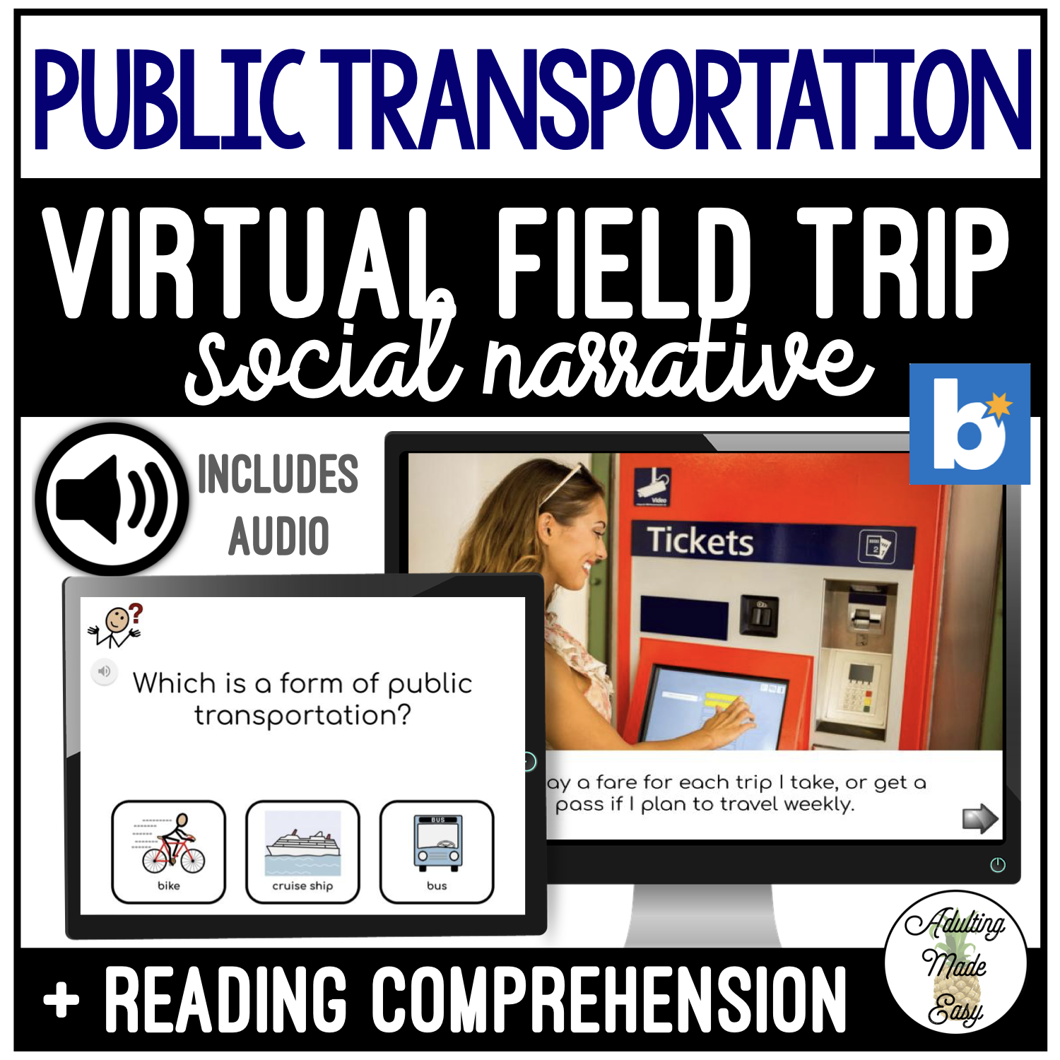 A virtual field trip narrated as a social story. Help ease the uncertainty and prepare your students with direct social skills instruction that is beneficial to students with special needs or autism. Discusses the different types of public transportation, what to expect when riding the bus or train, paying for fare or a ticket, etiquette, sign meanings, safety, and more!