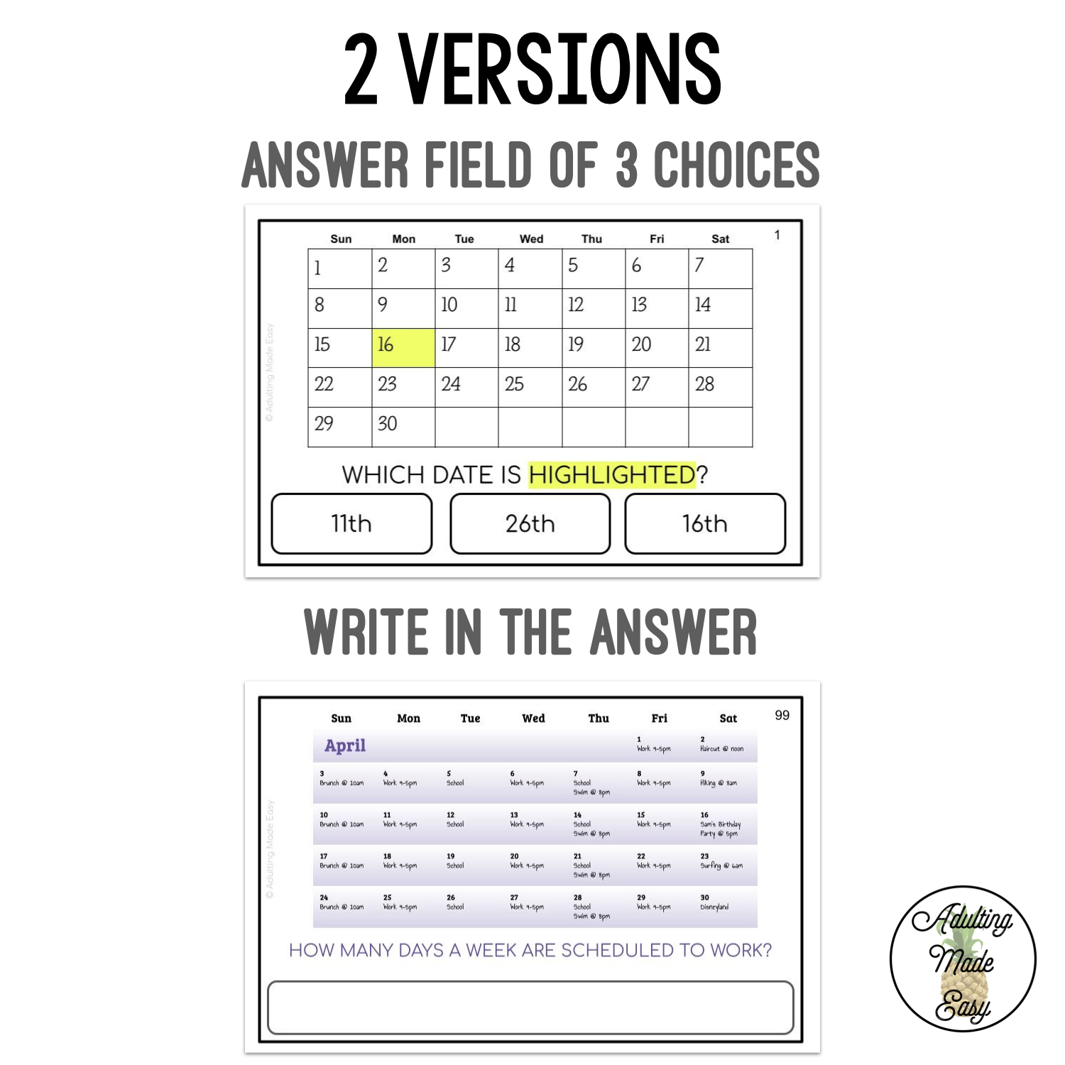 • 2 Simplified calendars with large print and just numbers on days with highlight to match answer field.
