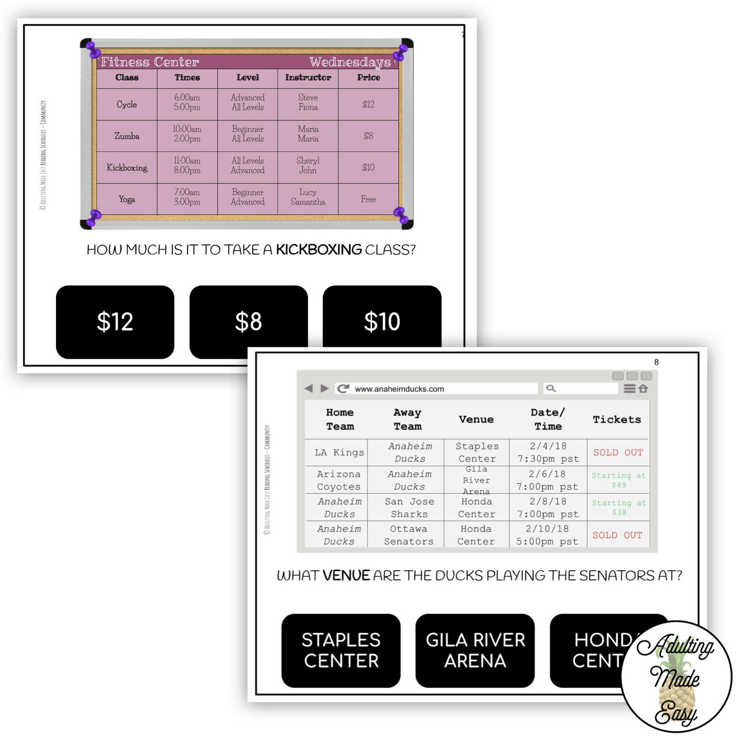Functional reading of Sports team schedule, Hockey Schedule, Movie Theater Schedule and Fitness Center Schedule. Practice skills in identifying specific items like name, time, price, location, money and time math. Age appropriate engaging activities for special education students! NO PREP, PAPERLESS. Distance or remote learning