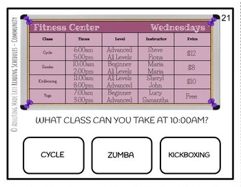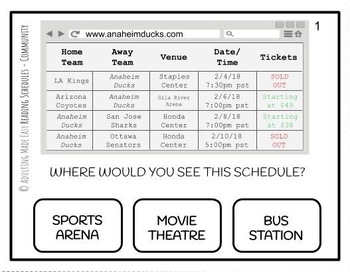 96 Differentiated Task Cards with Sports team schedule, Hockey Schedule, Movie Theater Schedule and Fitness Center Schedule. Practice skills in identifying specific items like name, time, price, location, money and time math. Age-appropriate functional reading activities for special education students!