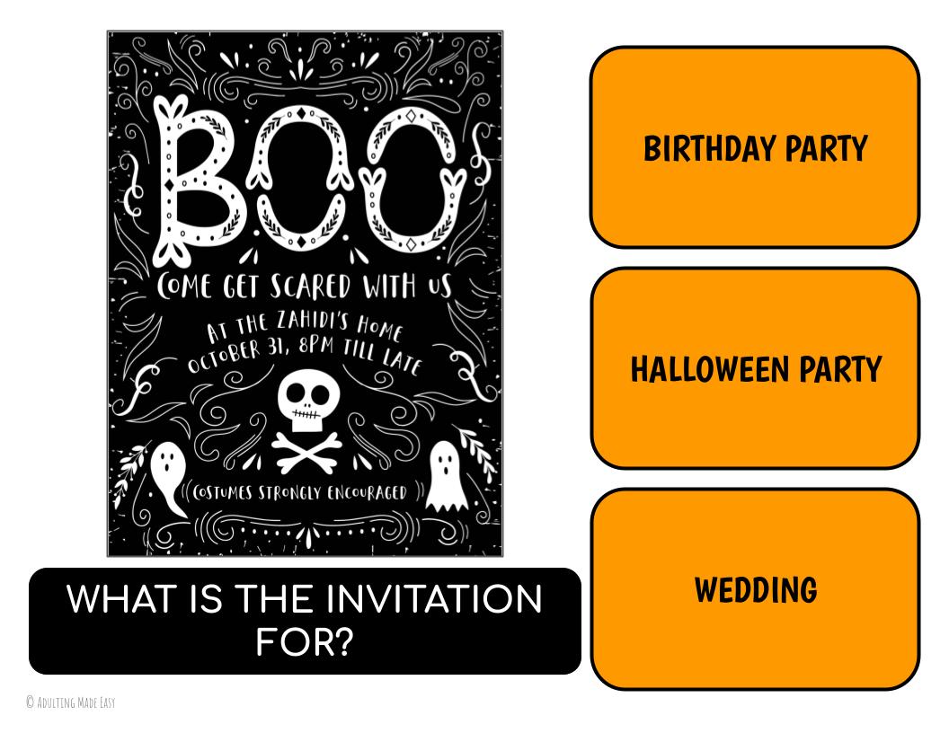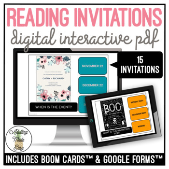 Functional reading comprehension of common life skills environmental print, differentiated for special education, autism or English language learner classroom. This NO PREP, PAPERLESS activity is a fun, engaging & visual way to practice reading different variations of cards, invitations, or flyers. Distance or remote learning