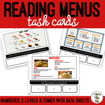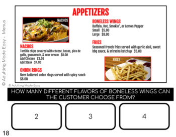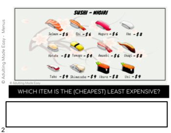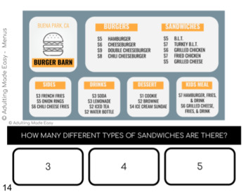 A fun, engaging & visual way to practice reading different variations of commonly seen restaurant or cafe menus. Students will identify prices, most or least expensive items, items on the menu, and other important information. This activity is great for special education students Distance or remote learning