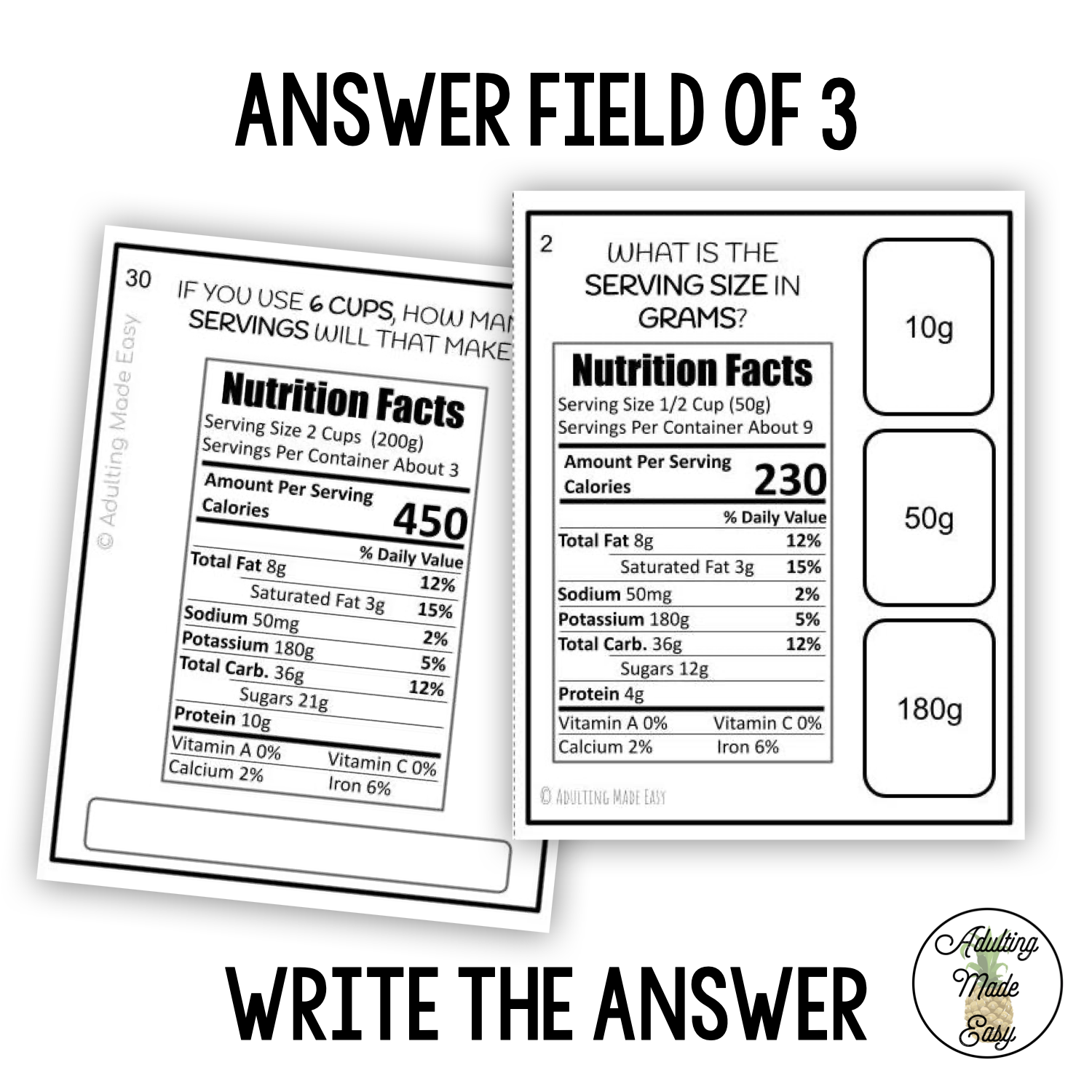 Students practice reading and interpreting nutrition facts labels, identifying specific information, and applying basic math skills to calculate servings, measurements, and calories.
