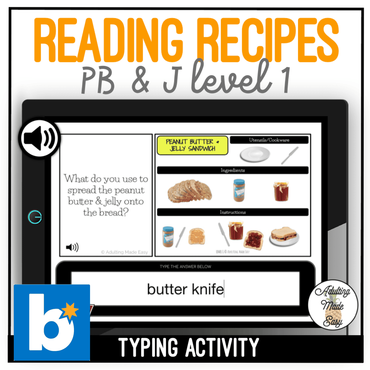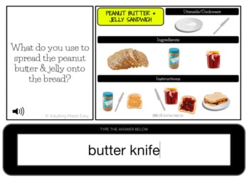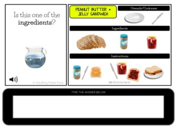 This simplified & visual recipe asks the reader to identify utensils/cookware, ingredients, instructions and more for a Peanut Butter & Jelly Sandwich recipe