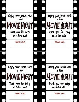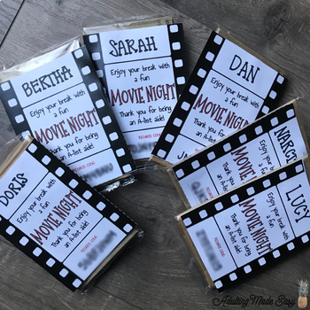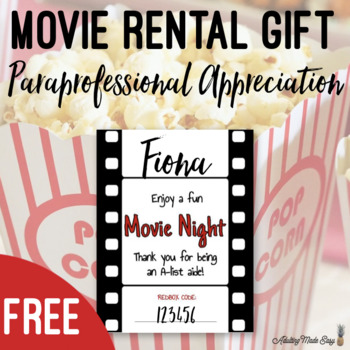 Redbox movie night gift labels for staff appreciation! Inexpensive and low prep gift idea for paraprofessional appreciation day, holiday gift, or end of year gift!