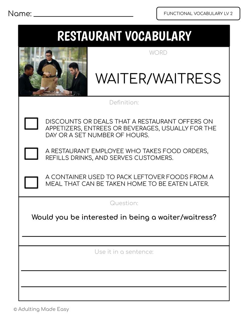 teens | adults | independent living skills | home ec | writing | community | menu | ordering out | real photos | images | age appropriate