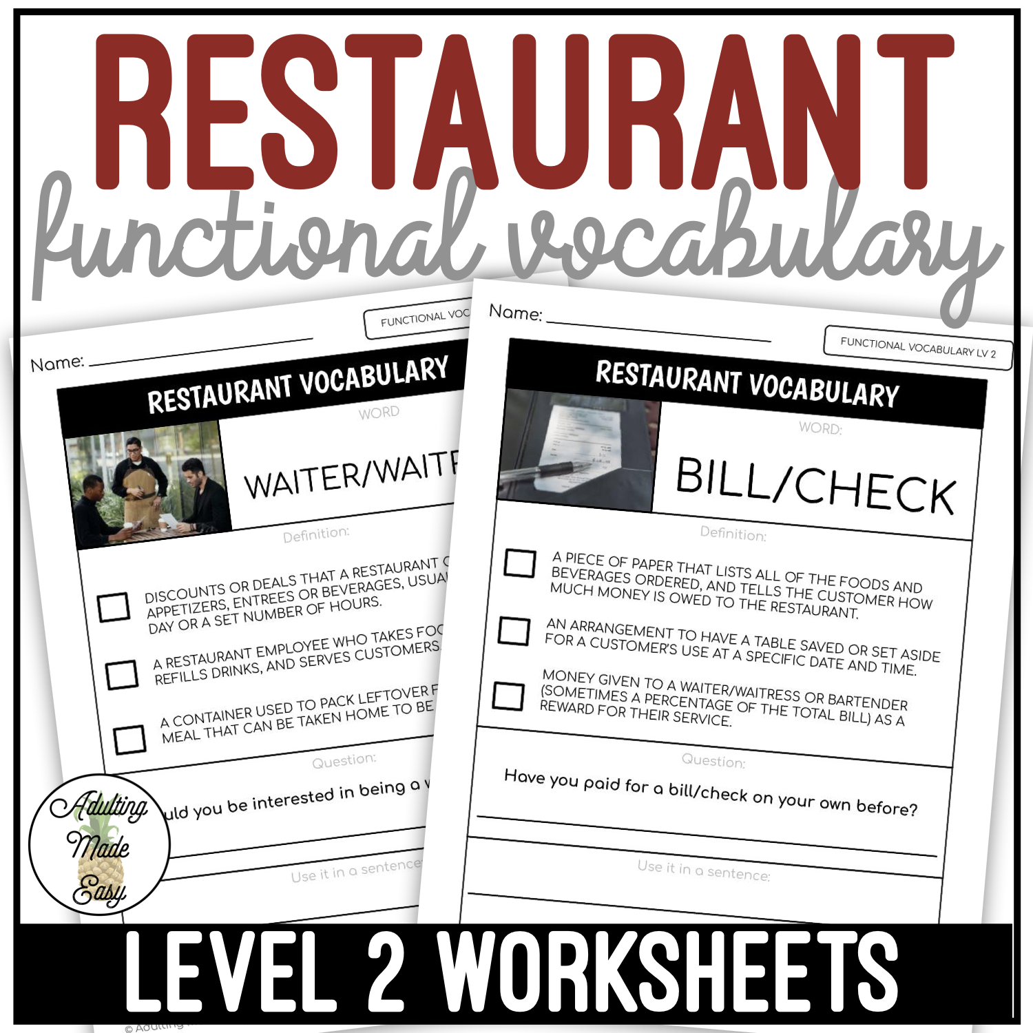 Vocabulary featured: appetizer, sandwich, beverages, entree, dessert, specials, small, medium, large, rare, medium, well done, spicy, tip/gratuity, a la carte, host/hostess, waiter/waitress, bill/check, buffet, menu, please wait to be seated, to-go box, reservation