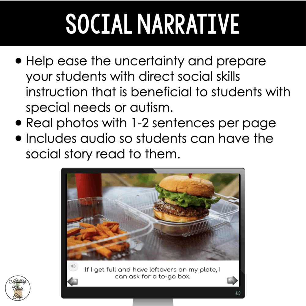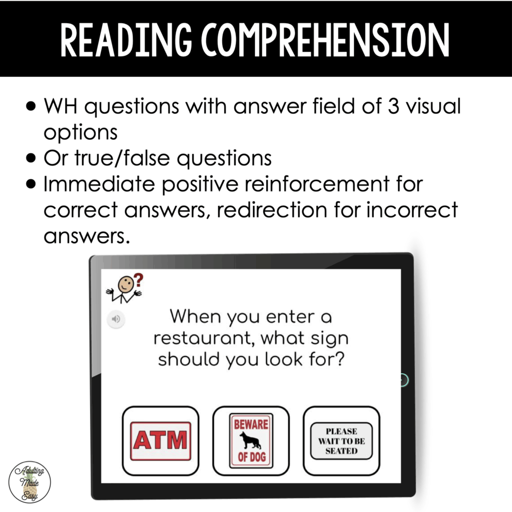 - Audio: Students can have the social story read to them, as well as the comprehension questions.