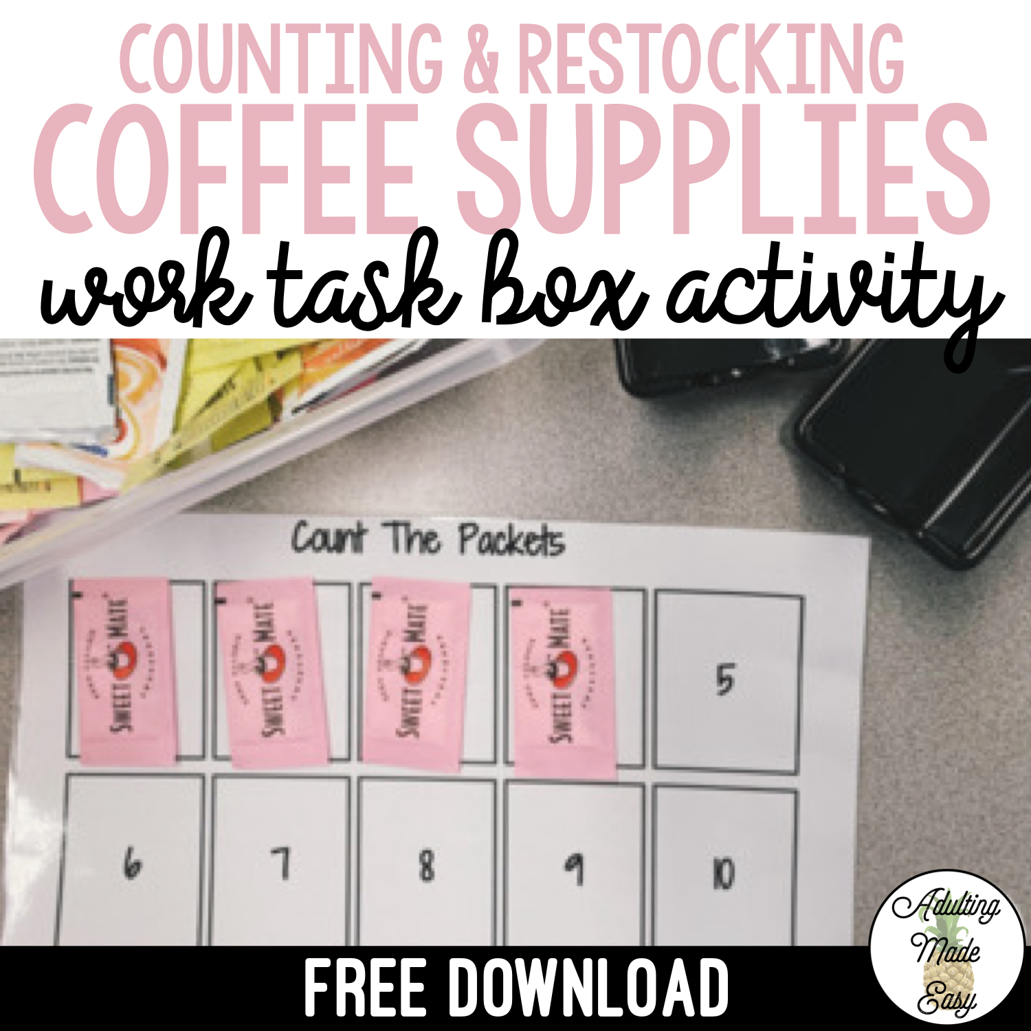 FREEBIE Visual boards for counting sugar & creamer packets to put into a packet holder (like you would see at a restaurant or coffee cart) independent work task bin. Great age-appropriate vocational activity for special education.