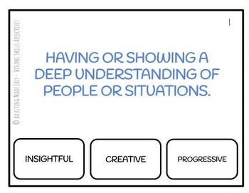 Adjectives included: insightful, perceptive, thoughtful, creative, progressive, determined, dependable, organized, dedicated, energetic, passionate, punctual, motivated, honest, flexible, innovative, persistent, loyal, personable, qualified, proficient, committed, spirited, attentive, unique, respectful, positive, strategic, methodical, imaginative, skilled, influential, earnest, devoted, driven, focused, detail-oriented, structured, diplomatic, and resourceful.