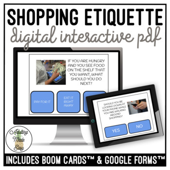 NO PREP, PAPERLESS, digital interactive PDF to practice identifying common shopping etiquette rules focusing in behavior and social skills in the community. Great age appropriate activity and discussion starter for special education classroom before going on a community outing (CBI) or field trip. Distance or remote learning