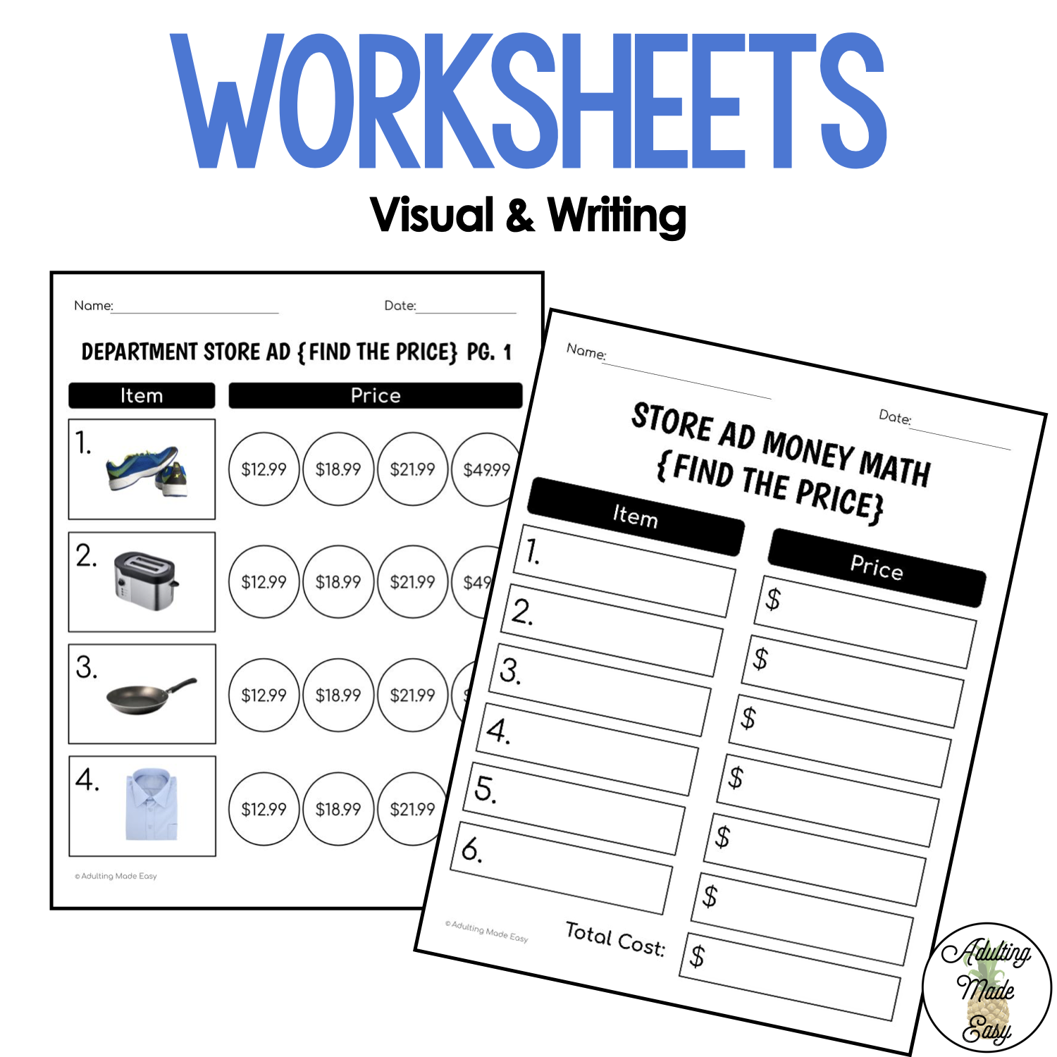 These simplified ads are great for students who are not ready to use real-store ads which can be overstimulating. Students will work on basic money math, identifying prices or items.