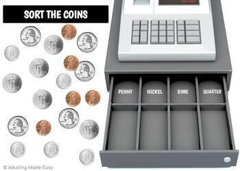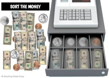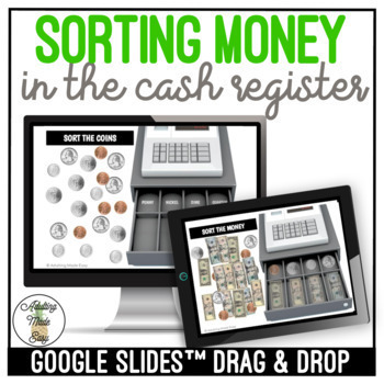 Differentiated Digital Independent Work task box activity where students can practice identifying money names and values while sorting coins and bills into a cash register.