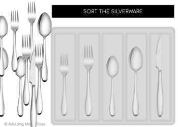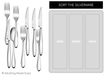 Differentiated Digital Independent Work task box activity where students can practice identifying utensil flatware: spoons, forks, and knives by sorting them into the correct basket.