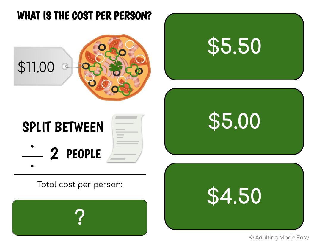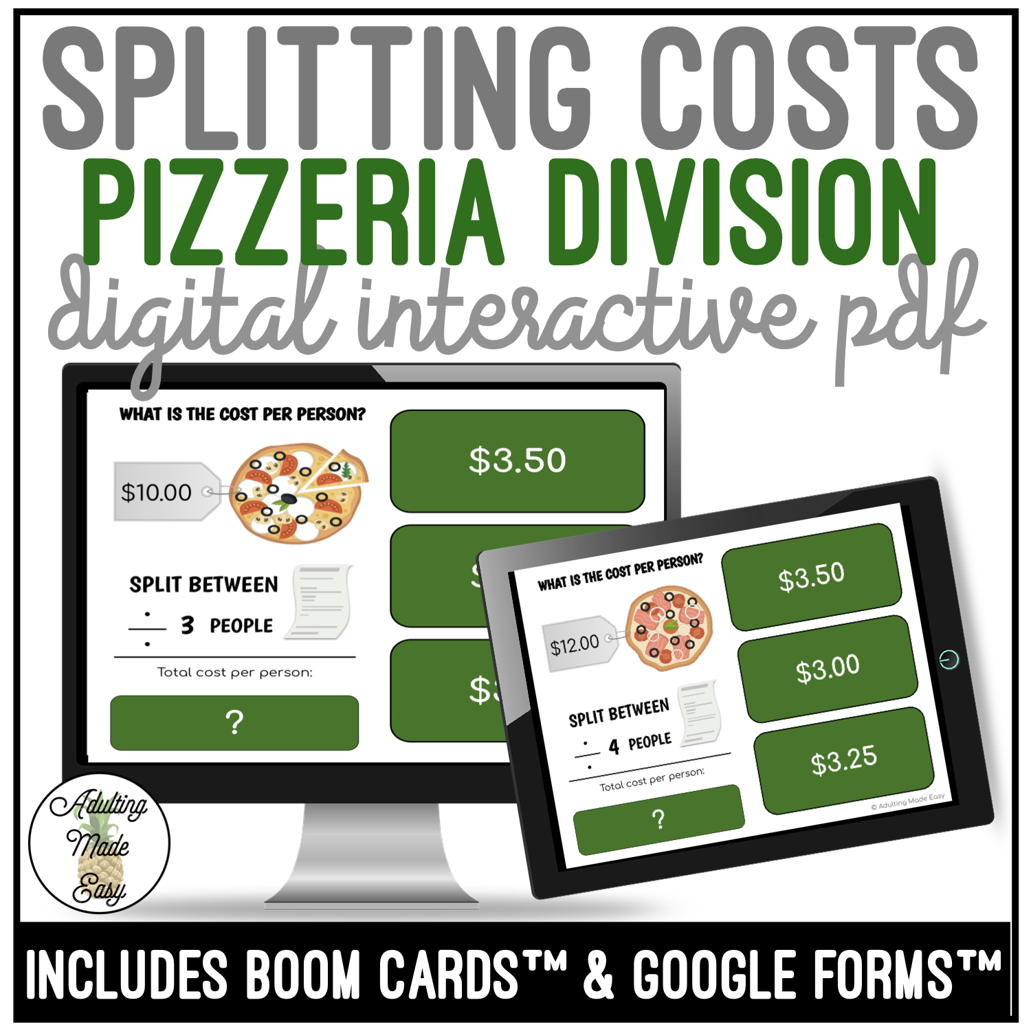 Functional life skills Math visual word problems. This activity is formatted to make dividing the cost of a purchase realistic and easier to understand for special education students. NO PREP, PAPERLESS. Distance or remote learning consumer math