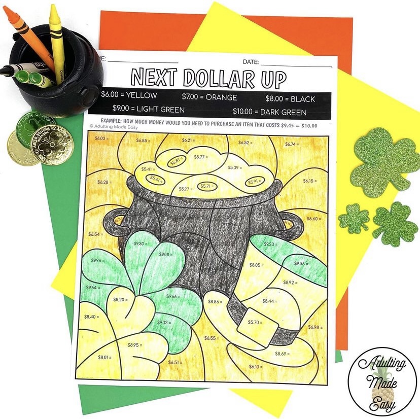 Are your students motivated by coloring and decoding puzzles? Here’s a fun Irish St Patrick’s Day themed activity to practice the Next Dollar Over method featuring leprechaun shoes & hats, horse shoes, Irish flag, pots of gold more!