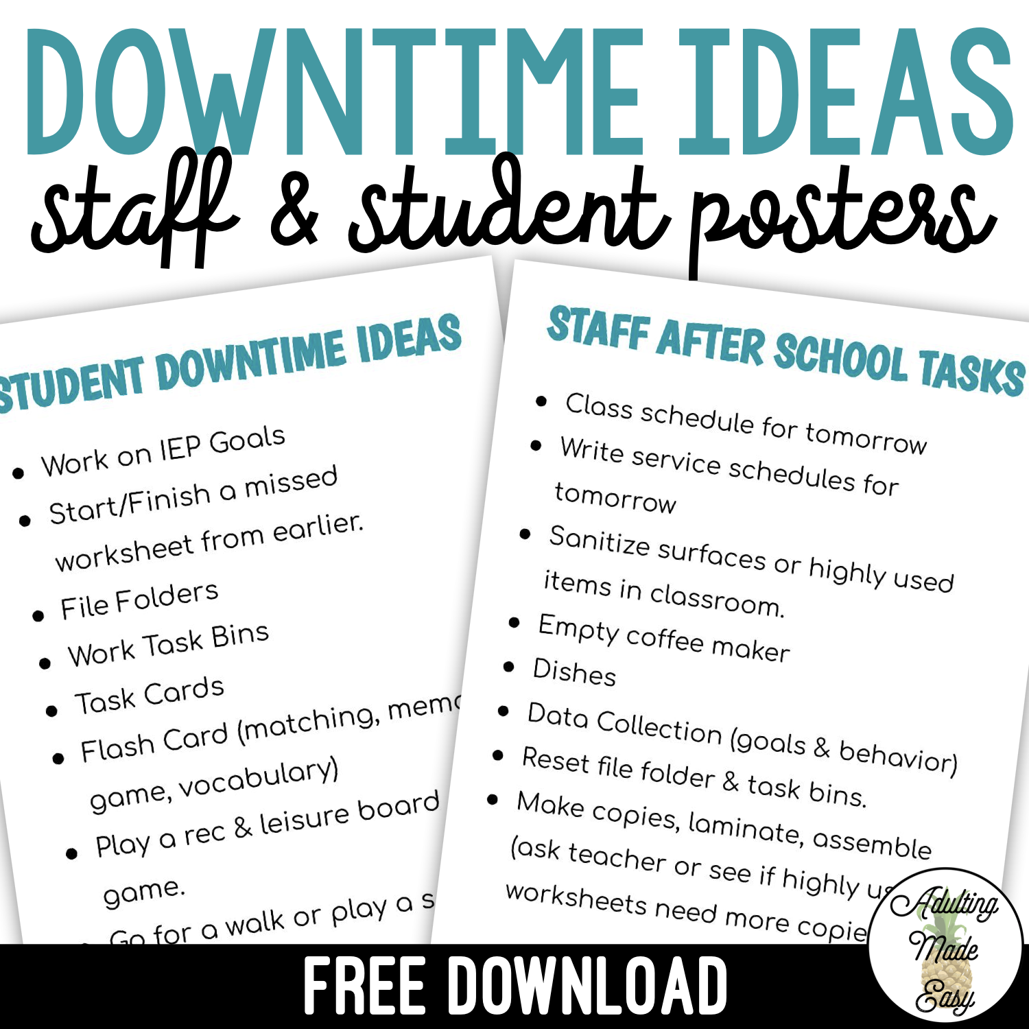 FREEBIE! Sometimes it’s easy to forget what to do next when there is downtime in the classroom or if the teacher is out of the room. These posters serve as reminders of things the staff can facilitate in the special education classroom. Print , laminate and hang up somewhere visible.
