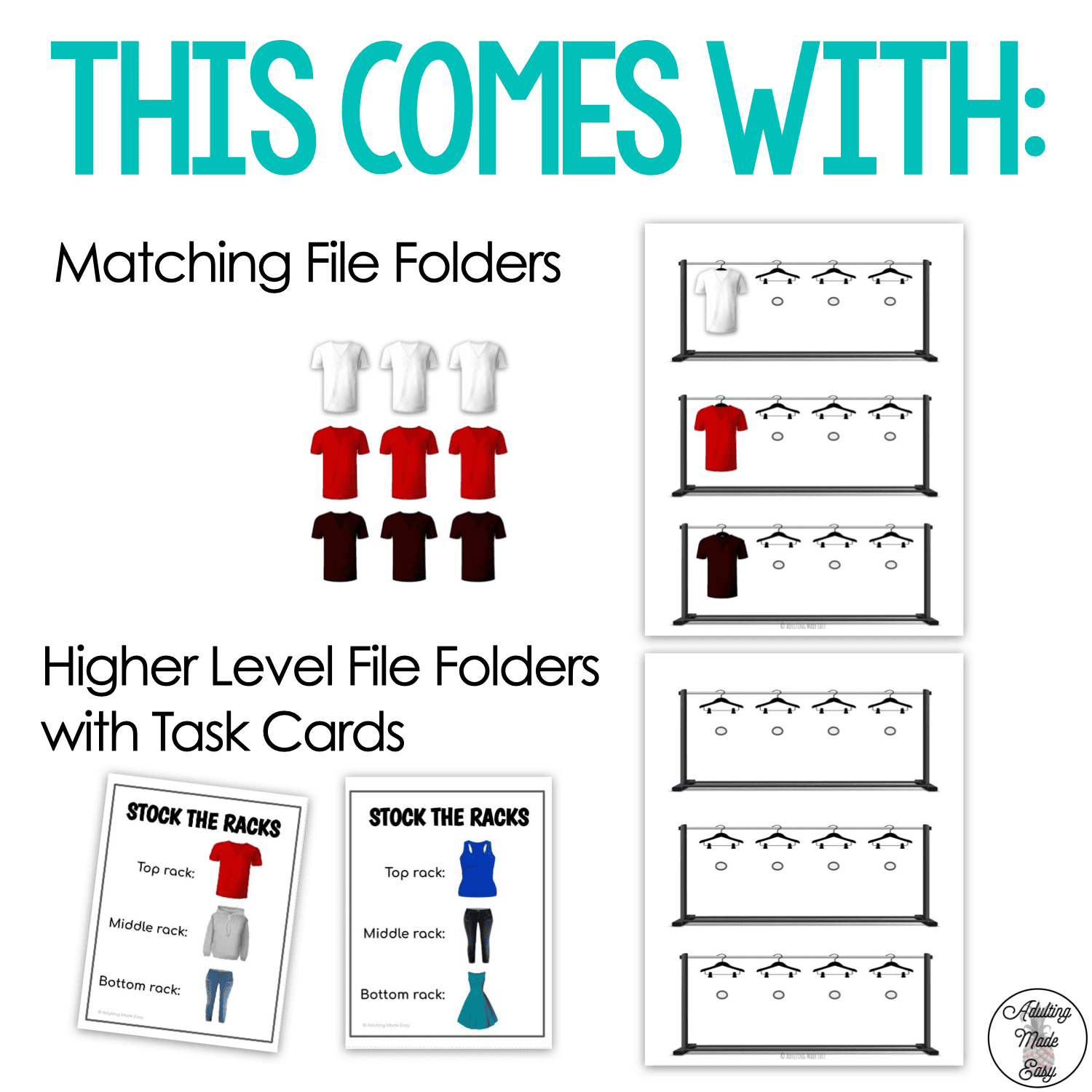 - 6 Matching “Stock The Shelf” File Folders with variety of clothing items