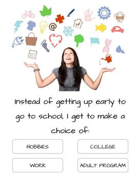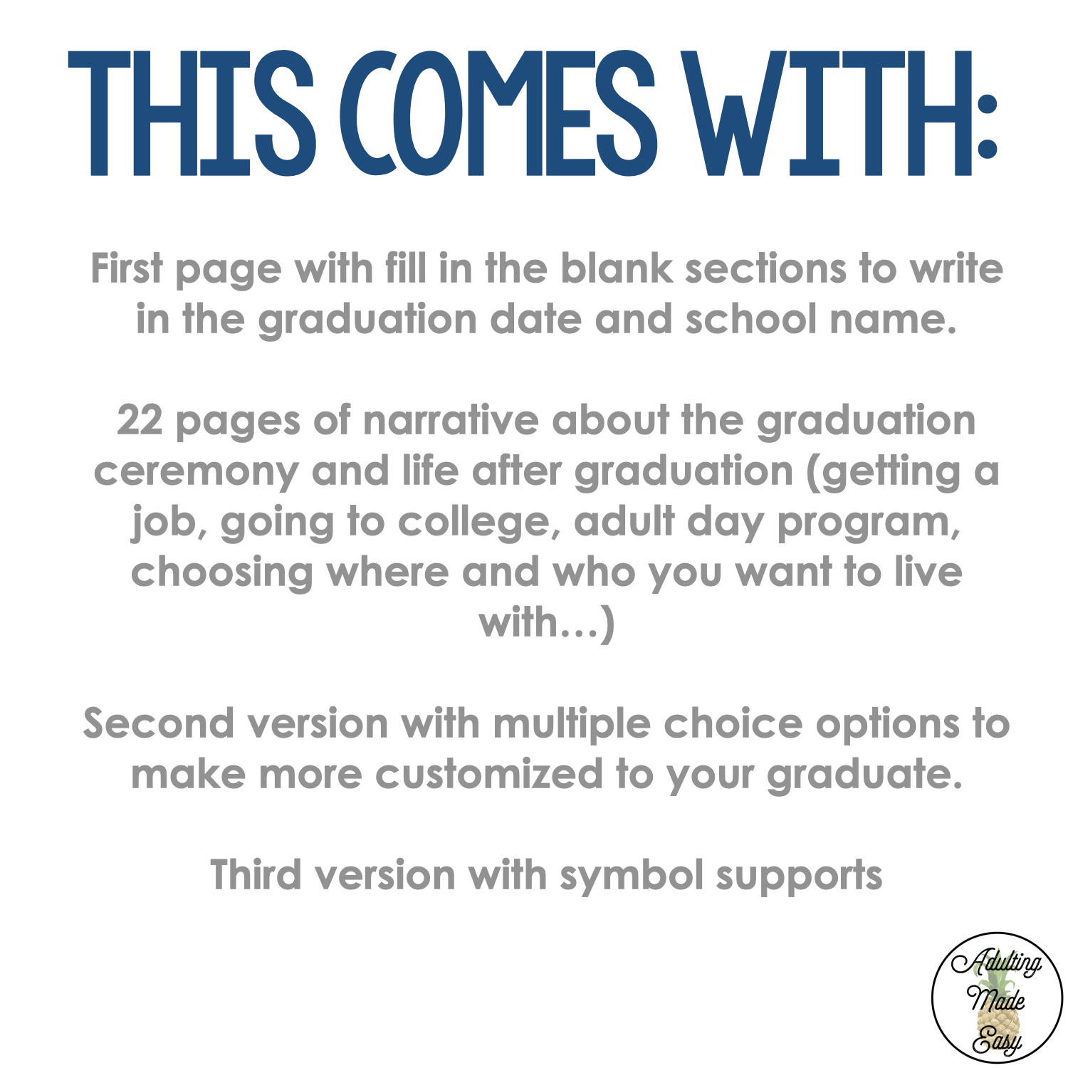 - 22 pages of narrative about the graduation ceremony and life after graduation (getting a job, going to college, adult day program, choosing where and who you want to live with…)