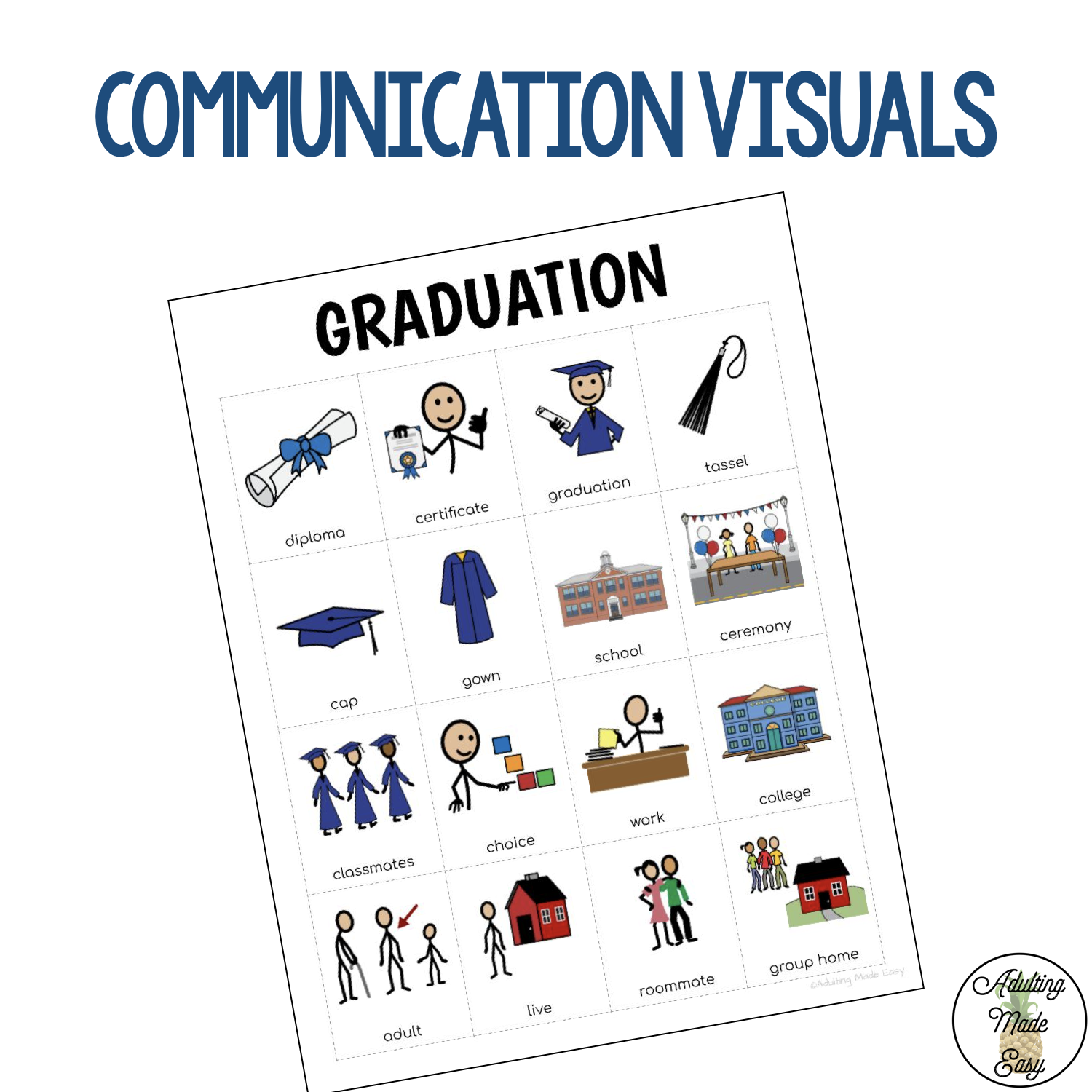 A simple story with the visuals and language you need to talk to students about an emotional event in their lives: GRADUATION! Graduating is a big event that leads to a huge change. The uncertainty of what happens during or after graduation can create anxiety and behaviors.