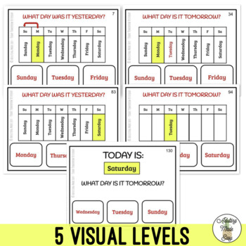 Essential calendar life skills activity for special education. Perfect for independent work, small group, or morning meeting. Great for learners that need to visually see the week laid out with color coding in order to understand the concept of today, tomorrow, yesterday, and the day after tomorrow.