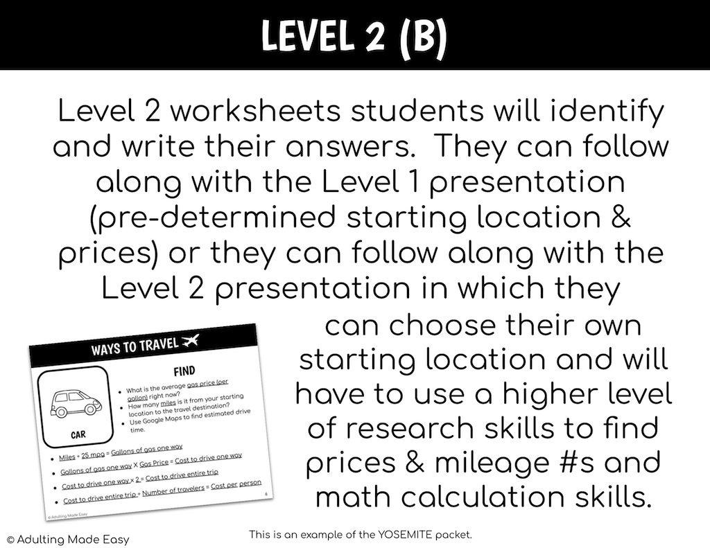 - Level 2 (B) Travel Plans Presentation – Students will choose their own starting location and will have to use a higher level of research skills to find prices & mileage #s.