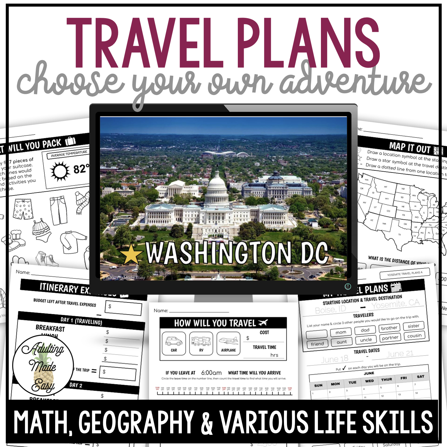 This differentiated activity is for all learners to practice the basic overall concept of planning a trip (in the United States) through basic math, geography, and various life skills you encounter when planning a trip.