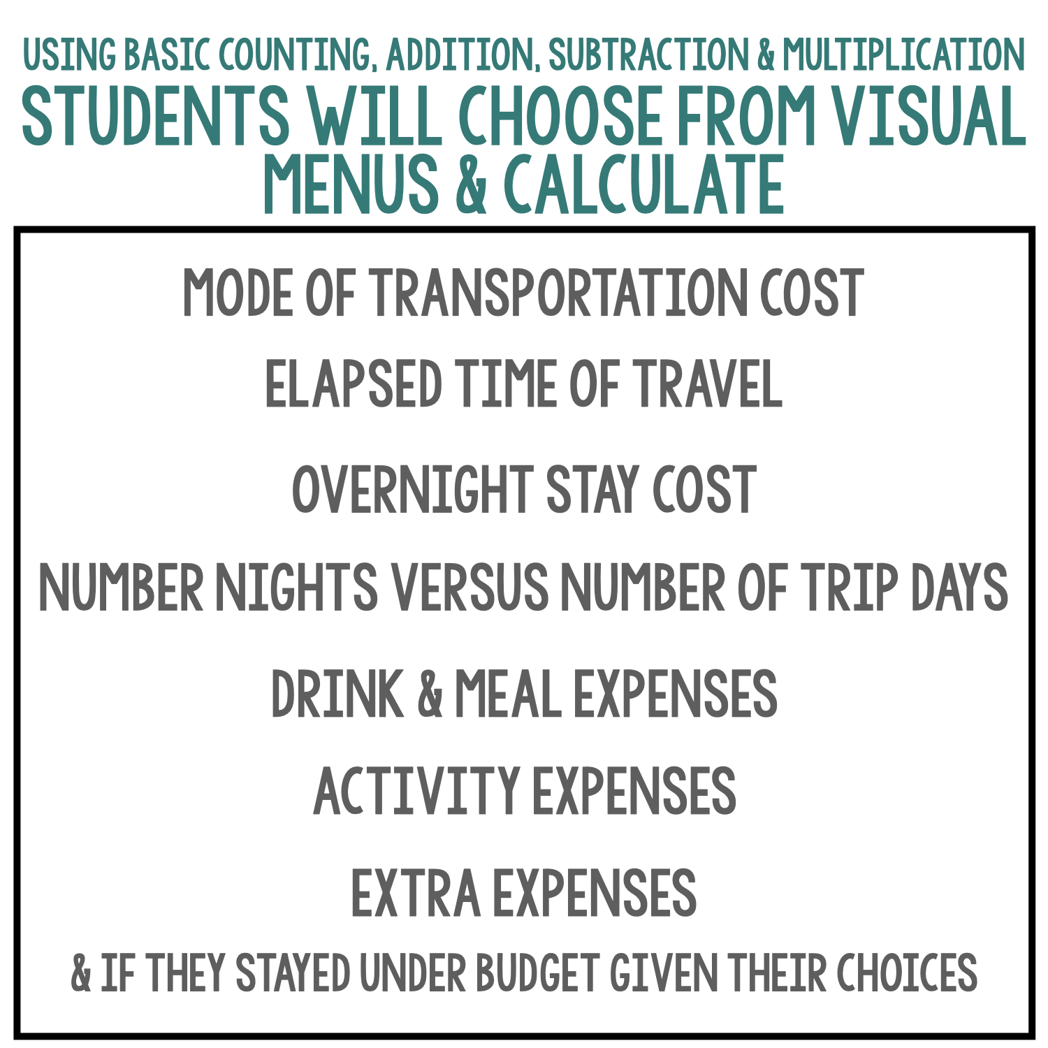 Students learn a little about the travel destination and in both levels get to “choose their own adventure” by choosing a way to travel, overnight stay, and itinerary expenses for meals and activities.