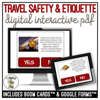 Teach important safety rules and social etiquette for traveling by airplane, train, and bus, as well as visiting unfamiliar places. This interactive digital activity covers topics like carry-on and check-in luggage, behavior expectations, safety awareness, and planning tips for a successful trip.