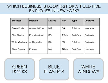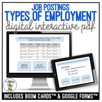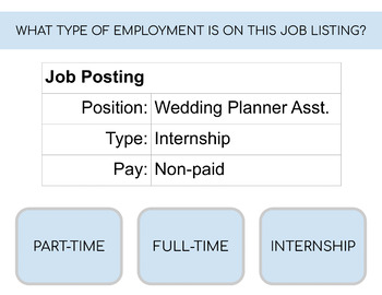 Help students build functional career readiness skills by searching for specific types of employment through real-world job listings. Students will become familiar with key vocabulary, including part-time, full-time, volunteer, internship, apprenticeship, and seasonal employment.