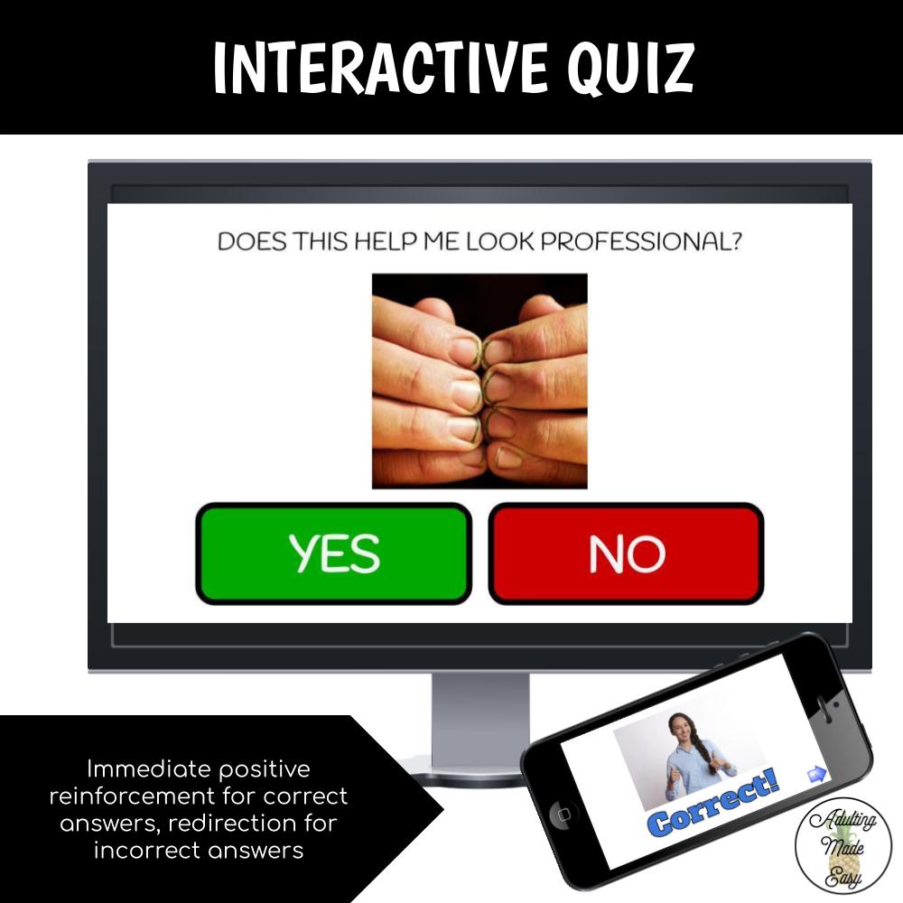 Career skills curriculum – Visual Interactive Lecture Presentation formatted like a social narrative with mini quiz that gives instant correct/incorrect feedback. Great for secondary special education students, distance or remote learning