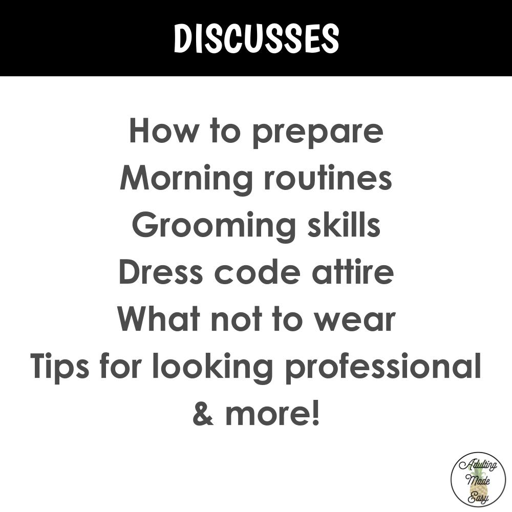 This lecture focuses on pre-vocational vocabulary and skills of Looking Professional for an interview or formal businesses or places of work. Basic concepts of hygiene & grooming routines, and casual & formal clothing etiquette.