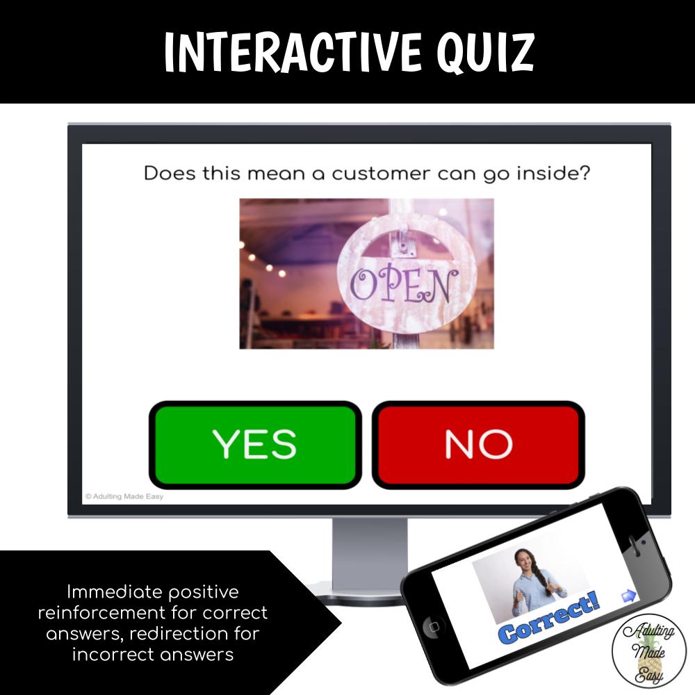 Career skills curriculum – Visual Presentation formatted like a social narrative with mini quiz that gives instant correct/incorrect feedback. Great for secondary special education students, distance or remote learning