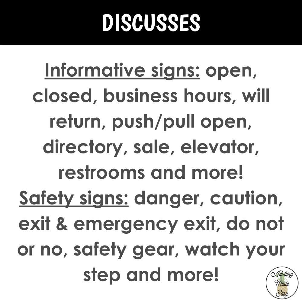 This unit focuses on vocational vocabulary and skills for understanding common signs seen in the workplace, but also works great as a COMMUNITY SIGNS lecture. This unit also goes over basic concepts of information versus safety signs, and identifying the meaning of many different signs. Some of the signs covered include open, closed, business hours, will return, push/pull open, directory, sale, danger, elevator, restrooms, exit, and do not. Many other signs are also covered!